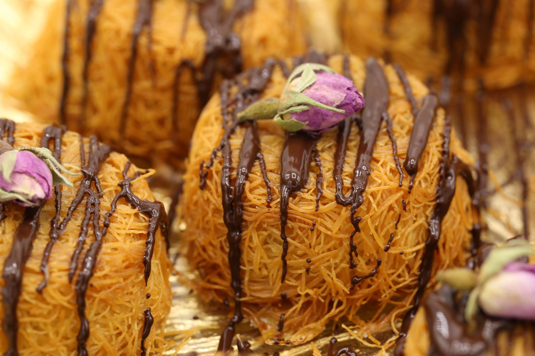 أخرجي الكنافة من القوالب وضعي في طبق تقديم. زيني الكنافة بالشوكولاتة المذابة وورق الورد.