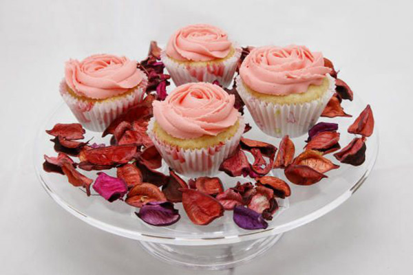 5. يدهن كل كوب بقليل من الكريما، ثم توضع كريما الزبدة، فعجينة «المارشميلو» باللون الوردي والتي تشكّل على شكل الورد الجوري.