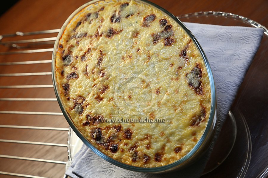 • في إناء كراتان توضع الخضر المطهية والمقطعة إلى مكعبات صغيرة، يسكب فوقها خليط القشدة/البيض. الخضر يجب أن تتغطى بالكامل بخليط القشدة/البيض.