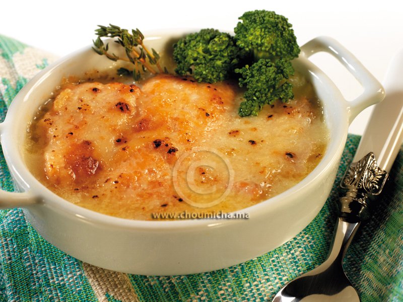 • في إناء كراتان، يصفف سمك السلمون وسمك السلمون المدخن ثم يسقى بصلصة البيشاميل الممزوجة بجبن الإمونتال.