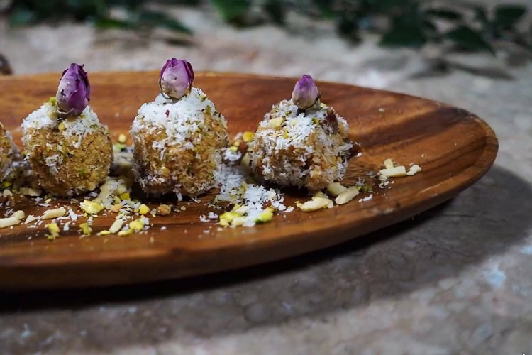 6. شكلي الخليط على شكل كُور، وغطيها بالمكسرات المطحونة وجوز الهند، وقدمي الحلى فوراً.