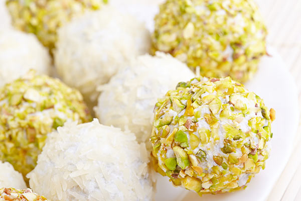 2. يُشكّل الخليط على شكل كرات صغيرة وتُدحرج في الفستق المطحون وجوز الهند.