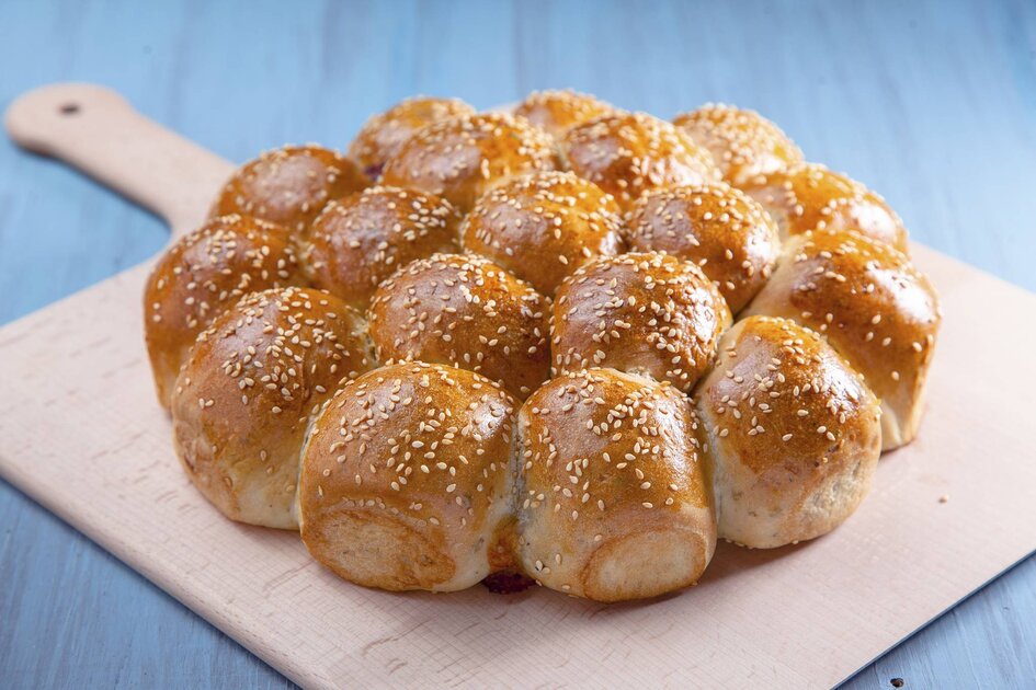 تدهن بالبيضة المضروبة وترش بالسمسم.