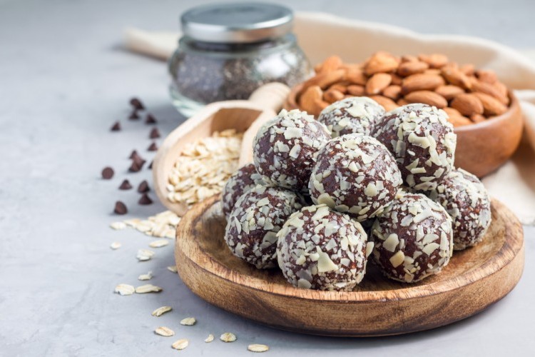 4. أخرجي الوعاء من الثلاجة واصنعي كرات صغيرة بحجم حبة الجوز واغمسيها بالشوكولاتة المبشورة أو باللوز.