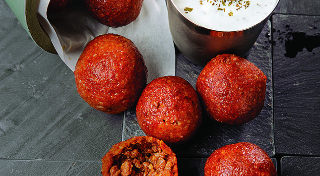 كرات الكبة المقلية بالسجق مع صلصة التغميس باللبن الزبادي والنعناع