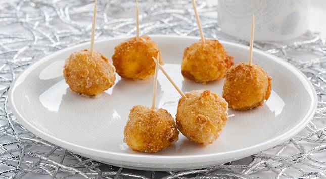 تُرش كرات الموتزاريلا بالدقيق، ثم تُغلف بالبيض، ثم تُدحرج في البقسماط.
