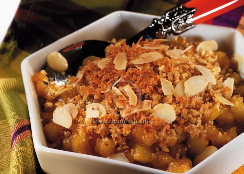 - في أواني فردية يوضع التفاح المعسل ثم يغطى بخليط الكرامبل.