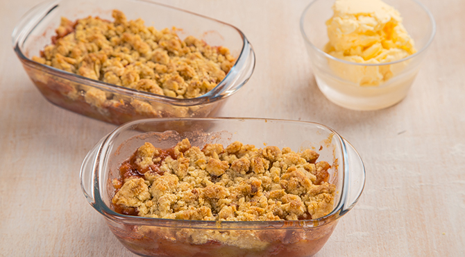 في وعاء حراري مناسب للتقديم ولكمية الحشوة يخلط التفاح والفراولة والبرش وعصير الليمون