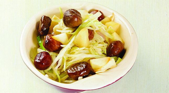 يضاف الكرنب إلى التفاح والبصل، ثم يضاف القليل من الملح والسكر. تغطى القدر ويُترك الكرنب ليطرى لمدة 8 دقائق تقريبًا.