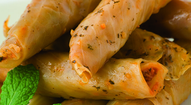 تُسطح أوراق الكرنب، ويوضع مقدار 1 ملعقة صغيرة واحدة من الحشو على كل ورقة.