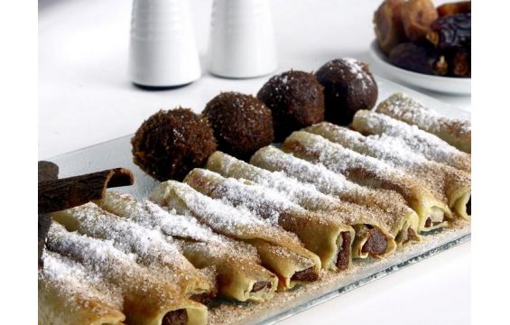 2. يشكّل معجون التمر بشكل أسطواني، ويوضع في طرف الفطيرة، بعد إعدادها. ثم، تلفّ بشكل أسطواني.
