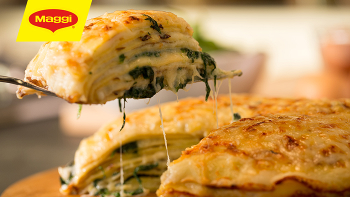 في هذه الأثناء، تُحضر صلصة البشاميل بمزج الحليب المقشد، وخلطة البشاميل من ماجي في قدر. يطهى المزيج على حرارة متوسطة حتى يصبح سميكاً لمدة 5 دقائق تقريباً ثم يترك جانباً.