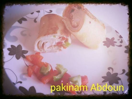 - للتقديم: نحضر واحدة كريب ونحشيها بجزء من الحشوة ونلفها رول ونكرر العملية حتى تنتهى الكمية ونقدمها مع بطاطس محمرة .