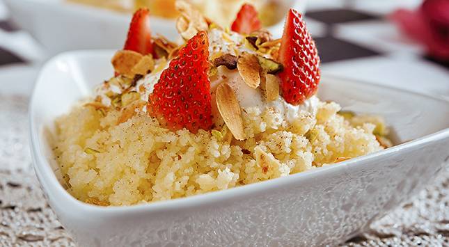 يوضع الكسكس بعد أن يبرد في طبق التقديم ويضاف عليه خليط الكريمة والمكسرات والفراولة ومسحوق القرفة
