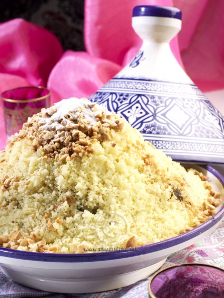 - يزين الكسكس المدفون باللوز المطحون، السكر الناعم والقرفة. يقدم الكسكس المدفون ساخنا مرفوقا بالحليب الطري المنسم بماء الزهر.