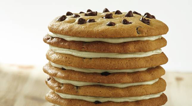 يُخلط الجبن الكريمي والسكر البودرة في وعاء الخلاط الكهربائي النظيف على سرعة من متوسطة إلى عالية حتى يصبح شاحبًا وزغبًا. يُفرد الخليط على 4 قطع من الكوكيز. توضع الكوكيز فوق بعضها البعض بحيث توضع قطعة الكوكيز العلوية غير مغطاة بطبقة الفروستنج.