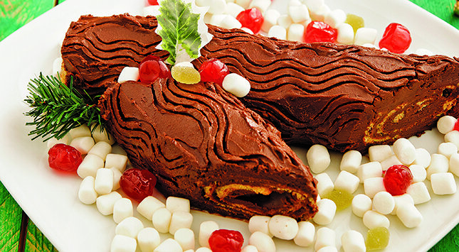يُفرد بعض الحشو على الكعكة، ثم تُلف على شكل جذع شجرة.