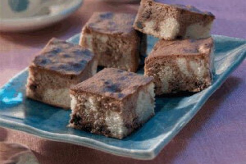 - تُسكَب نصف كمية المزيج في صينية خَبز قياسها 23 × 28 سم دُهَنت بالزبدة ورُشَّ عليها الدقيق. يُضاف مسحوق الكاكاو إلى الكمية المتبقّية من المزيج ويُحرَّك المزيج حتى يصبح ناعمًا. تُضاف إليه رقاقات الشوكولاتة ثم يُحرَّك. يُوزَّع مزيج الكاكاو بالملعقة بشكلٍ عشو