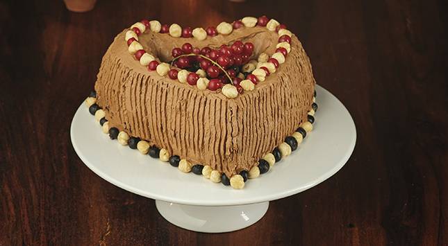 يُمزج البندق المطحون والسكر والدقيق والبكينج باودر والكريمة والملح والكاكاو ثم يُضاف ويُقلب مع خليط الصفار والبياض.