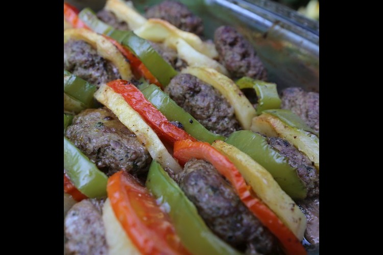 4. جهزي صينية الفرن (البايركس)، وابدأي بوضع قرص لحم الكفتة، ثم البطاطس، والطماطم، والفليفلة، وكرري العملية حتى الانتهاء من الكمية.
