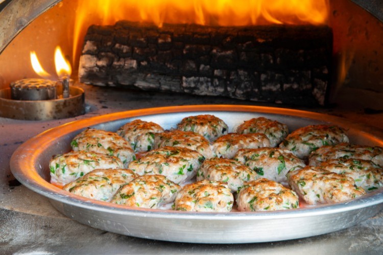 - شكّلي كرات متوسّطة الحجم تشبه الكفتة ، في صينية ضعي الزيت و قومي بوضع كرات الكفتة.