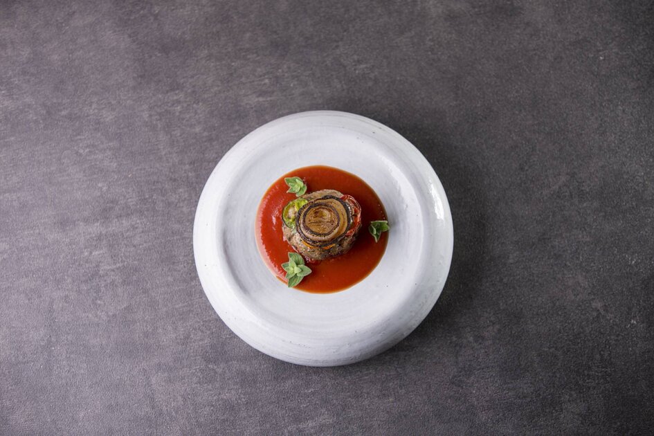 تصف قطع الطماطم المشوية في الصينية وتتبع بأقراص الكفتة والهالبينو ثم البصل، تعاد إلى الفرن وتشوى لمدة 7 دقائق على حرارة 200 درجة مئوية