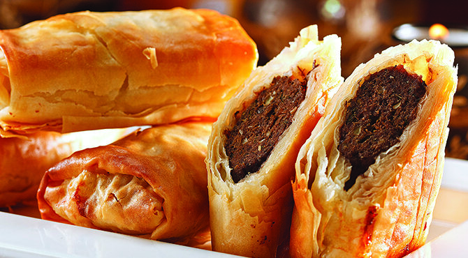 تقطع أوراق الجولاش إلى أحجام تكفي لتغليف مستطيلات الكفتة وتدهن بالزيت.