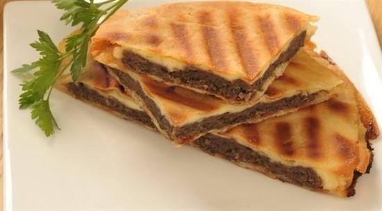 - في مقلاة تيفال غير لاصقة ضعي نقطة صغيرة من الزيت ورصي شرائح البسطرمة لتتحمص قليلا من الجانبين مع رشها بالملح والفلفل رشة خفيفة ثم ارفعيها جانبا وغطيها بفويل .