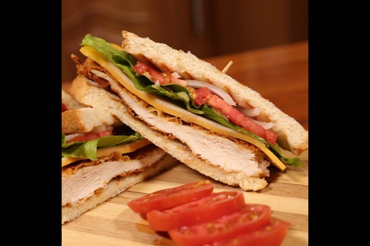 6. لتحضير كلوب ساندويش الدجاج: حمصي شرائح التوست، وضعي قطعة من الدجاج المقلي فوق الخبز، ثم شريحة من جبنة الشيدر، وصدر التيركي، والخس، والطماطم، وشرائح من البصل، وضعي شريحة ثانية فوق المكونات.