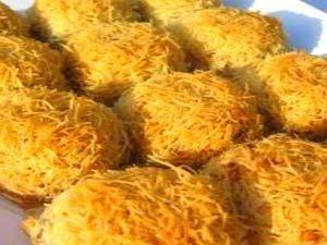 - خذي بعض شعيرات الكنافة ، ضعيها في داخل القوالب بحيث تغطى القاع والجوانب ، وتصبح على شكل دوائر أو أعشاش العصافير