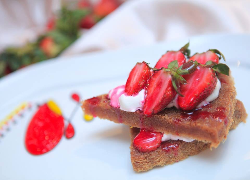 - وإتركيها تبرد وقلبيها من الصينية وقطعيها مثلثات و على كل مثلث ضعى الكريم شانتيه وقطع الفراولة .