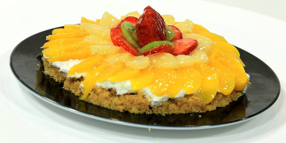 - ثم تفرد فوقها الكريمة ثم يتم وضع مجموعة من الفواكه ( المانجة و الكيوي والأناناس والفراولة)