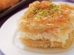 يوضع طبق التقديم فوق الصينية ثم تقلب الكنافة فيه ويمكن رش فستق مطحون علي