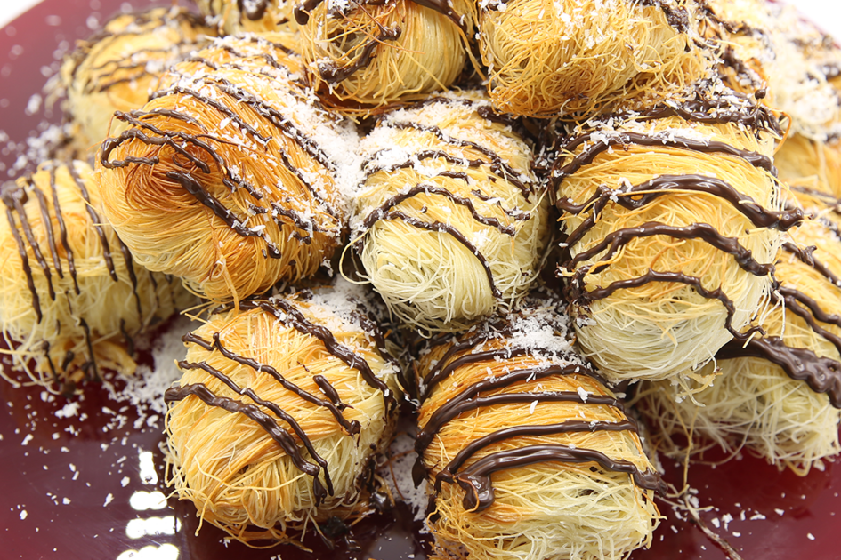ضعي الكنافة على طبق التقديم وزينيها بشوكولاتة جالكسي المذابة.