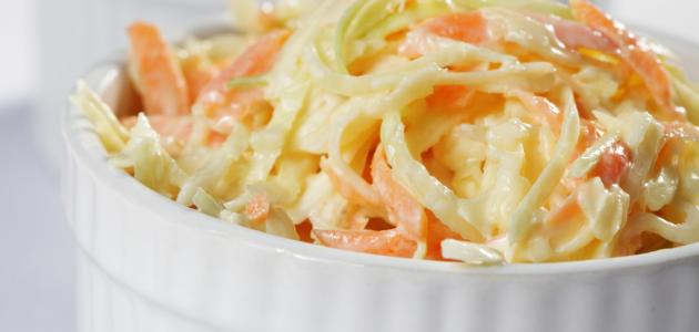 نقوم بتقطع الكرنب والجزر الصغير جدا ثم في وعاء كبير نقوم بخلط بقية المقادير جيدا ونخفقها الى ان تصبح ناعمة جدا ومن ثم نخلطها مع الجزروالكرنب ثم نقوم بتغطيها ونضعها في الثلاجة لمدة ساعتين على الاقل .