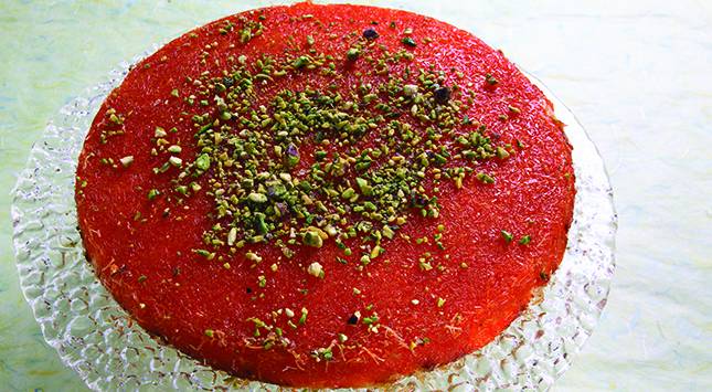 تُزين الكنافة بالفستق الحلبي، وتُقدم ساخنة