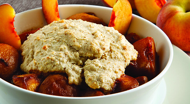 يخلط‭ ‬الشوفان‭ ‬مع‭ ‬اللوز‭ ‬المطحون‭ ‬والحليب‭ ‬والبيكينج‭ ‬باودر،‭ ‬ثم‭ ‬يضاف‭ ‬الخليط‭ ‬بملعقة‭ ‬على‭ ‬الخوخ‭.‬