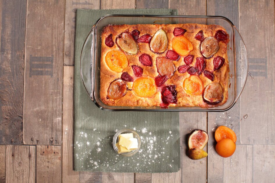 يتم خلط مكونات العجين سويا لمدة 10 دقائق ثم يتم رص الفاكهة ثم يصب العجين وتخبز فى الفرن لمده 40 دقيقة على درجة حرارة 170 وتقدم