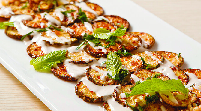 تصف حبات الكوسة في صحن وتغطى بصلصة الطراطور.