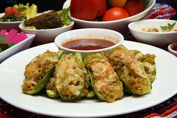 3. نسلق الكوسا بماء وملح لمدة 7 دقائق، ثم نصفيها، ونحشيها بالفريكة والصنوبر، ثم نضع فوق كل حبة جبنة الموزاريلا المبروشة ونحمرها بالفرن.