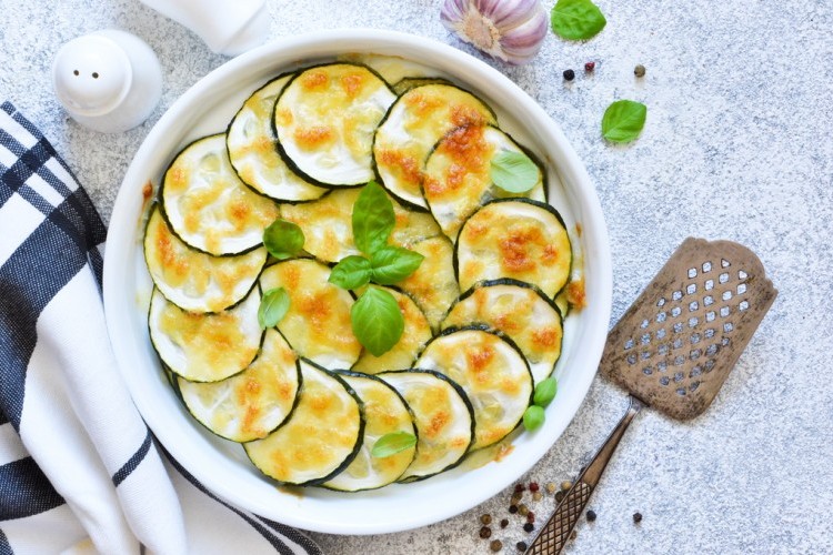 - رتبي الكوسا في طبق الفرن ثم وزعي الملح وأضيفي مزيج الزبدة والجبن والثوم.