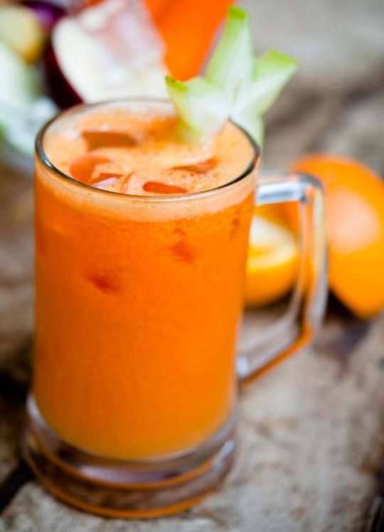 ١. يعصر التفاح والجزر، يخلط عصير التفاح، عصير الجزر والليمون الحامض مع بعض ويقدم.