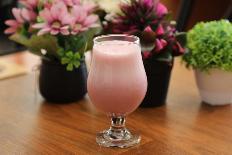 - صُبي الحليب على الفراولة واخلطي المكونان جيداً حتى يتجانسان.