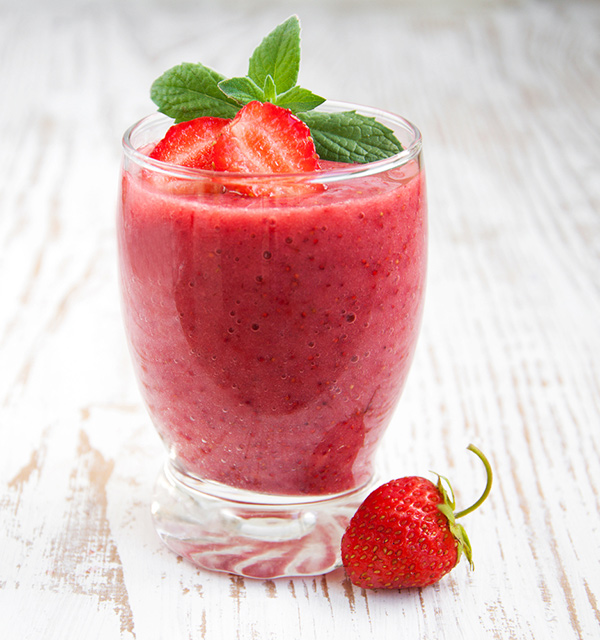 2. يقدّم عصير الفراولة في كوب طويل مع الثلج المطحون، ويزيّن بقطع الفراولة.