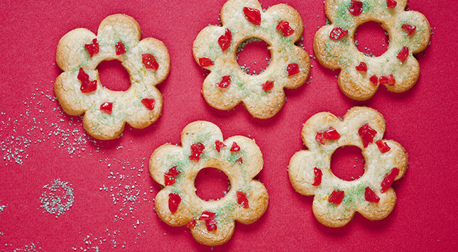- 3 حبة كرز أخضر مكرمل، و كرز أحمر مكرمل، مقطع إلى قطع صغيرة، وسكر باللون الأخضر للتزيين