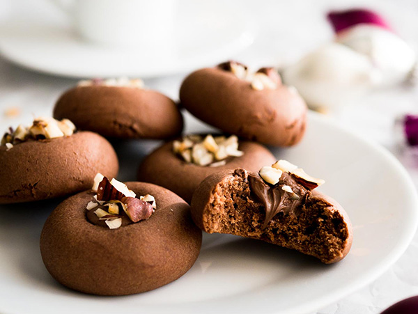 8. املئي الحفرة بالنوتيلا ورشة بندق مفروم، ننصحك باستخدام كيس كريمة بفتحة متوسطة لحشو الكوكيز.