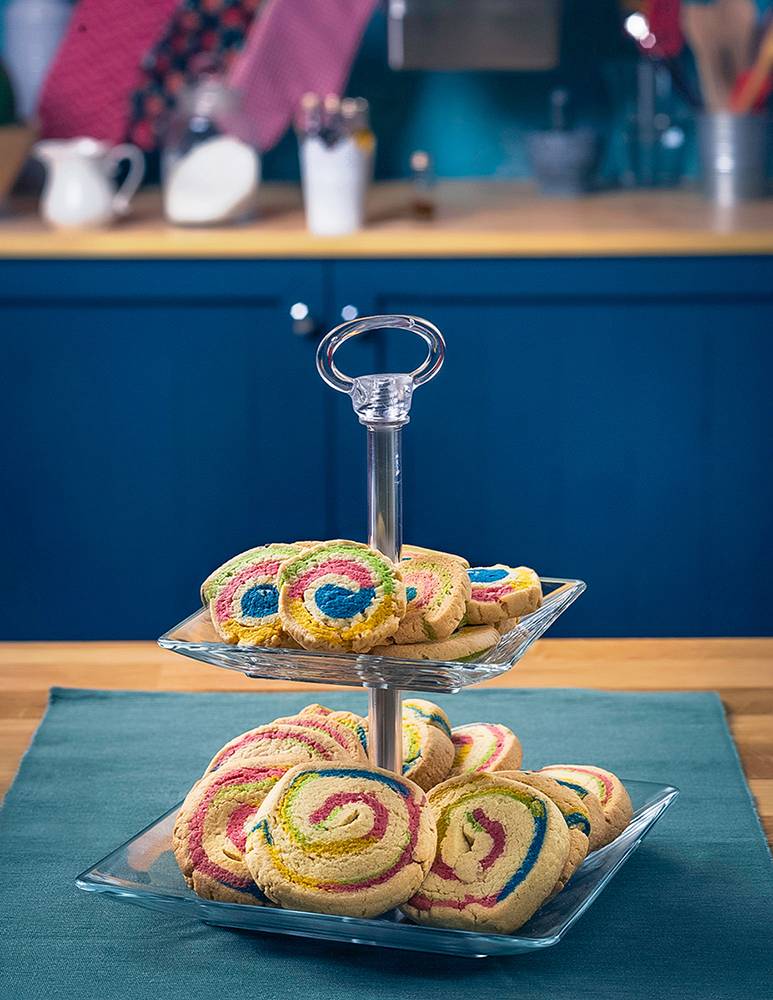 تلف العجين السادة و عليها طبقة العجينة بالالوان من اليمين الى اليسار حتى تصبح ذات شكل اسطوانى