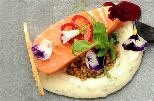 اقتراحات كونفيت السلمون مع صلصة الكرفس ومخلل البصل الأحمر والشمندر: