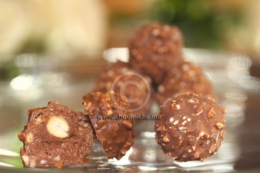 - تشكل كويرات من خليط الشكلاطة المخصصة للدهن ومسحوق اللوز ثم تحشى باللوز الكامل المحمص.