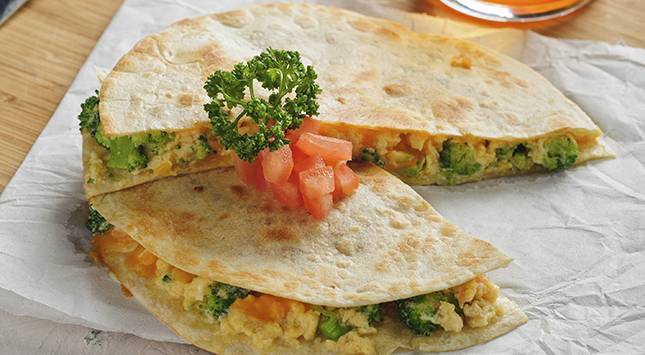 بمجرد أن يبدأ الجبن في الذوبان قليلاً، يوزع خليط البيض والخضروات فوقه. يُضاف باقي الجبن عليه، ثم توضع قطعة التورتيلا الأخرى على الوجه.